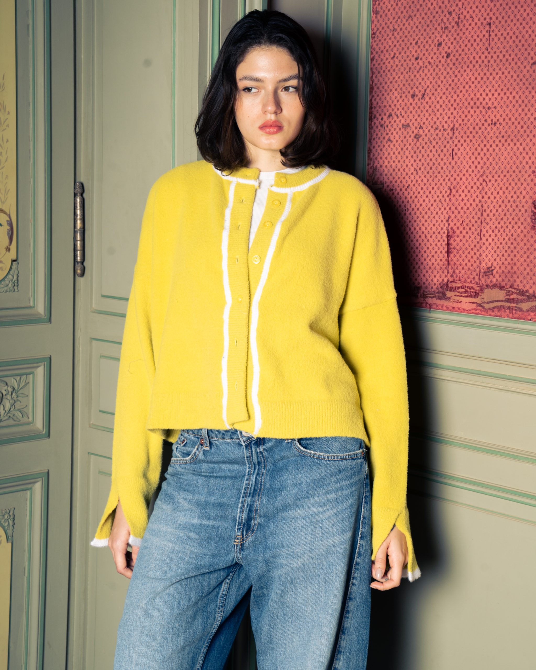 Yellow cardigan with white trims